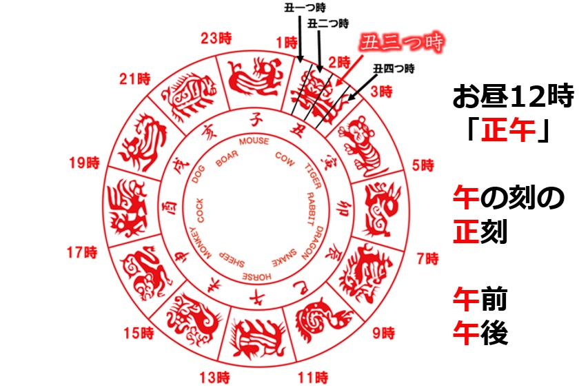 干支で時刻を数える場合の数え方は、午前0時前後の2時間を「子の刻」とし、それ以降、2時間刻みで丑、寅…と順番に続いていきます。